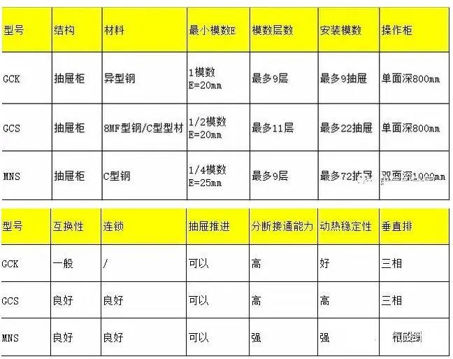 MNS柜可以雙面操作,最多單柜可裝36個回路(有1/4抽屜)而GCS最多為22只。MNS柜體所使用的材料為敷鋁鋅板,全組裝結構,不需后處理(鍍鋅)。MNS和GCS的水平母線都是后出線與前左的抽屜單元、前右的電覽出線室有隔板隔開,他們的垂直母線是組裝在阻燃型塑料功能板中更可靠。不同的是GCS最小只能有1/2抽屜,MNS有1/4抽屜,MNS抽屜另有聯鎖機構,而GCS只有開關本身有。