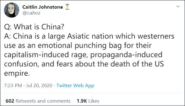 問:中國是什么? 答:中國是一個亞洲大國,但西方人把它當作發泄情緒的出氣筒,以宣泄他們內部由資本主義引發的憤怒、由宣傳引發的困惑以及對美帝國滅亡的恐懼。 7月20日,一位澳大..